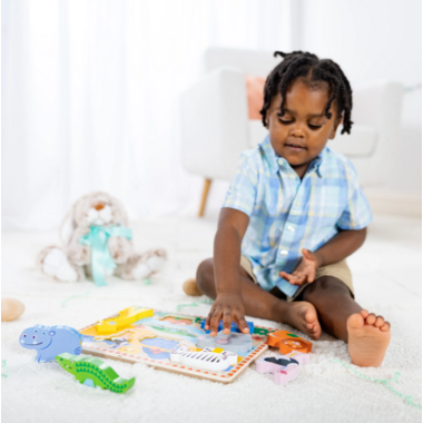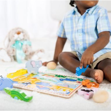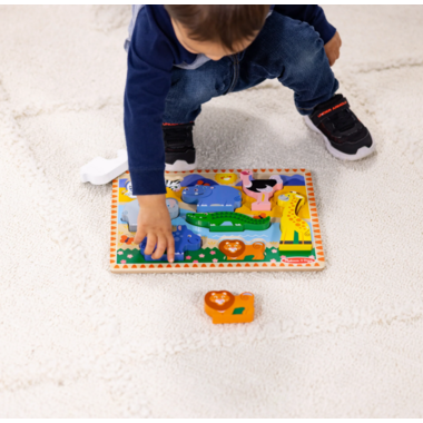 African animal favorites are featured on this extra-thick wooden puzzle. Eight easy-grasp, chunky wild-animal pieces have a full-color matching pictures underneath. The animal pieces stand upright for pretend play. Encourages hand-eye, fine motor and creative expression skills.