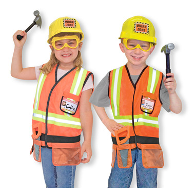 Work zone ahead! Your little construction worker will be ready for the job with this bright orange, machine-washable, vest high-lighted with reflective material and a tool belt, a yellow hard hat, goggles, a hammer, a saw, and a name tag for personalizing.