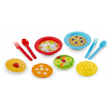 Satisfy hungry imaginations with this 12-piece set of durable bowls and switch-and-serve inserts! Fit the two bowls with inserts that look just like macaroni and cheese, salad, tomato soup, chicken noodle soup, corn flake cereal, and oat o’s cereal. Two forks and spoons also included to enhance the pretend play experience. These play bowls combine perfectly with other Create-A-Meal collections to create well-balanced fun!