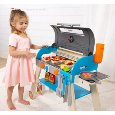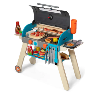 Fire up pretend play with this perfectly kid-sized wooden barbecue grill, smoker, and pizza oven play set! Pour pretend wood chips into the smoker box in the back of this lift-top grill. Budding young chefs three and older will love creating make-believe barbecue favourites like steak, chicken, burgers, hot dogs, corn -- and even play pizza! Place wooden play food “uncooked” side up on the grill, griddle, or side burner, set the built-in timer, pretend to baste, then flip with the included utensils to see grill marks!