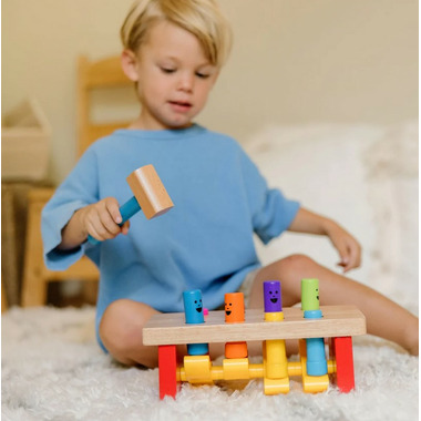 The pegs on the bench go up and down, playing peekaboo on this solid wood pounding activity. Non-removable pegs take turns showing their smiles while your toddler has fun naming the colours and enjoys practicing fine motor skills. A sturdy mallet is included with this Melissa & Doug Deluxe Pounding Bench!
