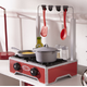It's easy to cook up a good time with this pretend play stovetop cook set! It includes all the utensils and ingredients needed for making breakfast, lunch, and dinner. The sturdy wood cooktop has removable burner grates and adjustable knobs and a rack for hanging pots, pans, and utensils.