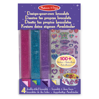 This exciting Melissa & Doug bracelet craft kit lets kids make their own accessories to wear and share! The set includes four two-sided kids' bracelets, with a different shimmering colour on each side. Just add the included sparkle-gem and glitter stickers to fill each one with flowers, hearts, butterflies, stars, loops, and swirls. Make your own bracelets, then close the reusable tab closure to wear your favourite, or layer a bunch for a sparkling fashion statement!