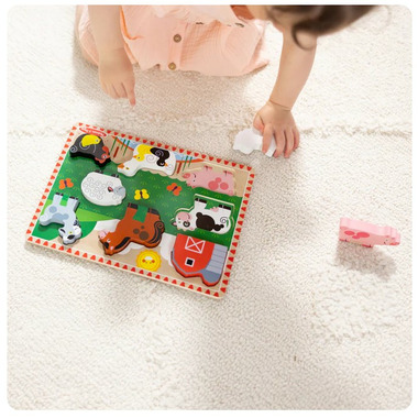 Have fun on the farm with this extra-thick wooden puzzle. It includes eight easy-grasp, chunky farm animals plus a chunky barn. Each piece has a full-colour, matching picture underneath. The barn and animal pieces stand upright for pretend play. This encourages hand-eye, fine motor and creative expression skills.