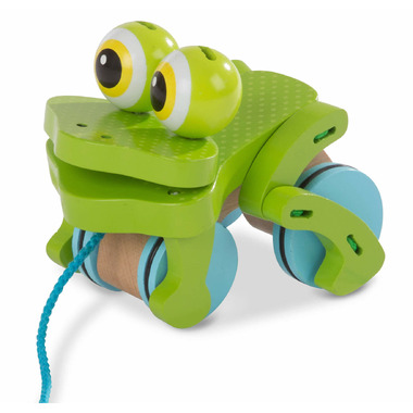 Kids will get lots of giggles from this frog that bounces, bobs, and jiggles! The bright green and polka-dot frog with big eyes and moving wooden parts will follow kids 18 months and older anywhere as they maneuver the “hopping” pull toy, encouraging movement and sensory development. Non-skid wheels move forward and backward, and the mouth opens and closes. First Play toys feature bright colours, bold patterns, and whimsical designs that boost skills while sparking imagination and wonder—right from the start!