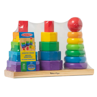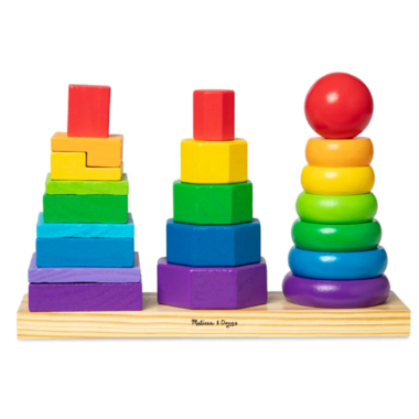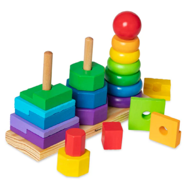 Match and Sort these 21 Colourful wooden pieces, and skill-building is just part of the fun. Rings, Octagons, and rectangles can be slotted onto the three rods, stacked on top of each other, or lined up to compare shapes, sizes and colours. This first-concepts set is a manipulatives all star!