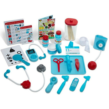 The doctor will see you now! The 25-piece Melissa & Doug Get Well Doctor's Kit Play Set offers realistic accessories let little doctors help patients get well! Kids three and older can pretend to check temperature, heartbeat, blood pressure, eyesight, hearing, and more. There are play tools like a syringe, play scissors, and reflex hammer, as well as play bottles, and bandages for examining and treating patients. Reusable activity cards and fun details like an ID badge on a lanyard and a magazine for patients in the waiting room round out the doctor's office experience. The play set is a fun and engaging way to ease any feelings of stress associated with a visit to the doctor and to encourage nurturing and empathetic play. Spark a child's creativity and imagination, and inspire young healers for years to come!