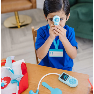 - Includes play stethoscope, blood pressure cuff, hearing tester, syringe, scissors, tweezers, rolling forehead thermometer, reflex hammer, otoscope, eye cover, tongue depressors bottles, ID badge, activity cards, and more