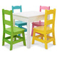Easy-to-assemble sturdy wooden table (white) and 4 wooden chairs in 4 different pastel colors (pink, yellow, green, blue) sized for kids