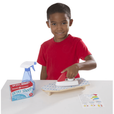 Kids will have loads of fun playing house with this these realistic laundry accessories! The 14-piece set includes a sturdy take-along basket to hold all the supplies and a reusable activity card to check off chores. Kids three and older will love spraying, measuring, and pressing with a stain remover spray bottle that can be filled with water, detergent and fabric softener bottles with removable lids, a box of three pretend dryer sheets, and a wooden iron and ironing board. Laundry day has never been such fun!