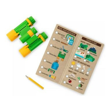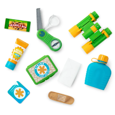 - Hiking essentials include play first aid kit, play binoculars, sunscreen tube with flip-top, multi-tool (compass, magnifier, saw, ruler), durable canteen, wooden snack bar, 6 double-sided animal track cards, trail guide activity book, pencil