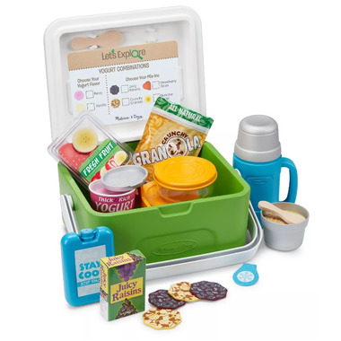 - Play food includes 2 double-sided soup and drink inserts, 2 double-sided yogurt inserts, felt raisins in box, 4 wooden fruit slices in clamshell container, felt granola in pouch