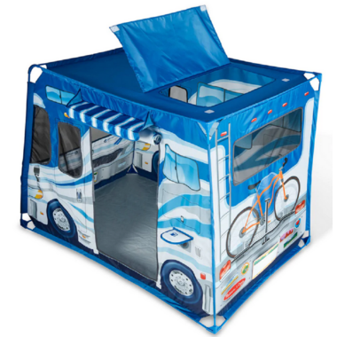 • 47" x 31" x 39" (assembled) camper-shaped play tent with door and roof flaps, screen windows, and lots of realistic details