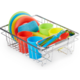 - Includes 4 place settings (cups, plates, forks, spoons, knives) plus squeezable soap bottle, mesh-covered sponge, and metal drying rack with utensil insert
