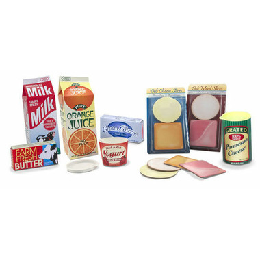 These versatile play packages look and feel just like the real thing! Their slightly smaller scale makes them easy to store in most play kitchens, and easy to handle as children open and close the tops, fill and empty the cans and boxes, and prepare countless pretend-play meals. The packages of Deli Cheese and Deli Slices even contain play-food pieces to add to the fun. Count them, stack them, sort them . . . then store them away in their realistic containers until your next culinary adventure!