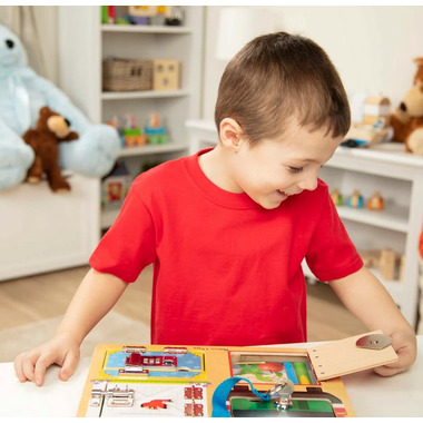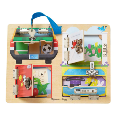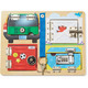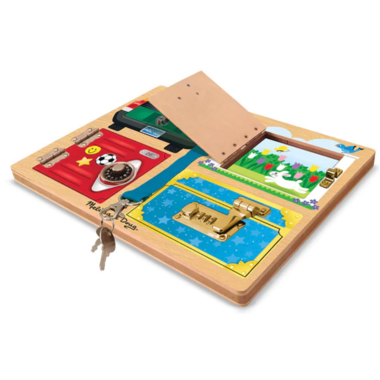 Unlock, unlatch, open the hinged panels, and count on finding fun when the pictures beneath are revealed! Kids will delight in discovering what's hiding behind the locked and latched panels on this wooden play board and educational toy in one. They can seek out a specific picture, race to open and close the doors, or tell a story inspired by what they find. A great way to build fine motor skills and hand-eye coordination while learning colours, numbers, animals, and more!