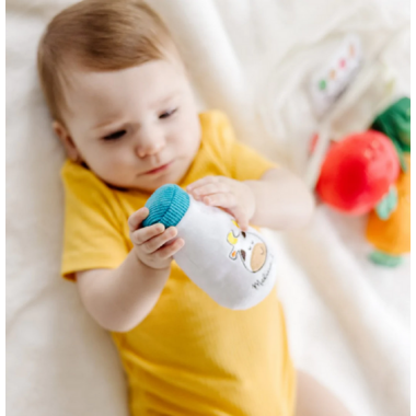 - The 5-piece infant toy includes a mesh grocery tote with handles, a plush milk bottle with chime, a silky-soft crinkling head of lettuce, a rattling soft tomato, and squeaking carrot
