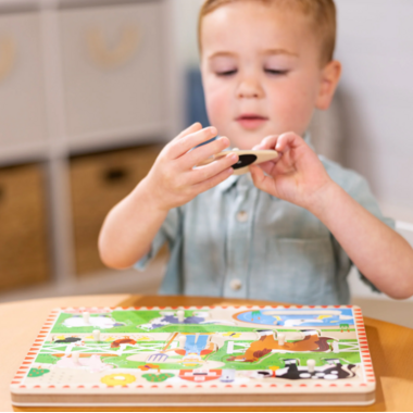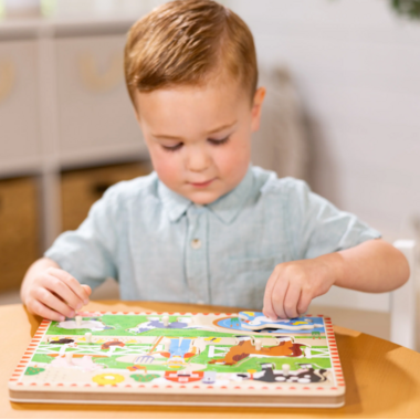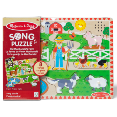 - Wooden peg puzzle that plays Old MacDonald song when pieces are placed