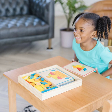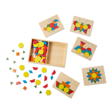 Get ready for lots of matching and mosaic fun! The Pattern Blocks and Boards classic wooden toy lets kids explore shapes and colors hands-on as they fill wooden backgrounds with colorful wooden pieces. The set features 120 bright and bold wooden geometric shapes that match designs printed on the double-sided wooden boards. Kids can choose from these 10 templates, or they can create their own unique designs.