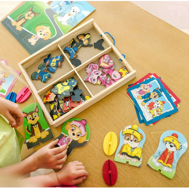 - Dress 4 wooden magnetic PAW Patrol play figures (Chase, Marshall, Skye, Rubble) in coordinating mix-and-match outfits