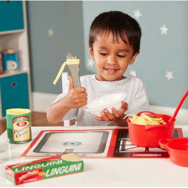 Prepare perfect pretend pasta every time with this 50-plus-piece pasta-making set! Fun pasta boxes hold felt penne, bow tie pasta, linguini, and ravioli pockets that can be hand-stuffed with felt spinach, meat, or cheese fillings. Follow the illustrated guide to order and "cook" the pasta in the large cook pot with lid, and "strain" it in the colander over the cooktop and sink play mat. Use the pasta spoon to scoop into the included pasta bowl, top with tomato sauce, cheese, or, butter toppings, and dig in! The set also includes a sauce jar, cheese shaker, salt shaker, and fork. This inventive set lets kids create countless imaginative pasta meals from start to finish!
