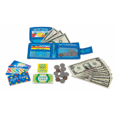 Make playful purchasing exciting with this 45-piece pretend play wallet, filled with everything kids need to run errands and go on make-believe shopping sprees! The folding nylon wallet with a self-stick tab closure has a long pocket to tuck away 14 play money bills, a see-through pouch for the 19 play coins, and handy slots for organizing 11 write-on cards, including bank cards, drivers license, library card, bus pass, and more! There are even “coupons” so young shoppers always get the best deals!