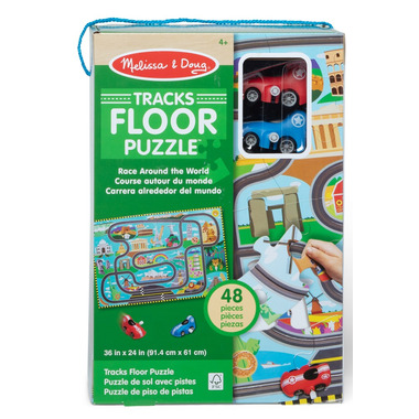 Piece together playtime with this global racetrack puzzle with built-in tracks for wind-up vehicles (no batteries required)! The 48-piece cardboard jigsaw floor puzzle features landmarks from around the world, including Niagara Falls, Big Ben, Mt. Fuji, the Sydney Opera House, and more; a key on the storage box identifies them all! Two wind-up racecars fit into the twisting and turning track on the completed puzzle; wind them up and watch them zoom! When kids work on floor puzzles, they are fine-tuning their gross motor skills, improving their hand-eye coordination, and strengthening their problem-solving skills. This high-quality Melissa & Doug puzzle and racing game makes an exceptional gift for preschoolers and school-aged kids for hands-on, screen-free play.