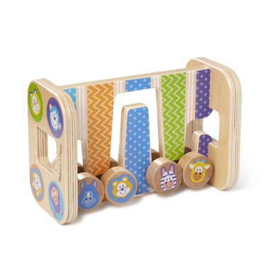 Get the fun rolling with this sturdy wooden tower and four pieces that spin down the zig-zag track! Babies and toddlers 12 months and older will delight in matching, stacking, and rolling the smooth, solid wood pieces with friendly safari animal faces that store right in the tower when it’s turned sideways. First Play toys feature bright colours, bold patterns, and whimsical designs that boost skills while sparking imagination and wonder—right from the start!