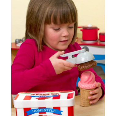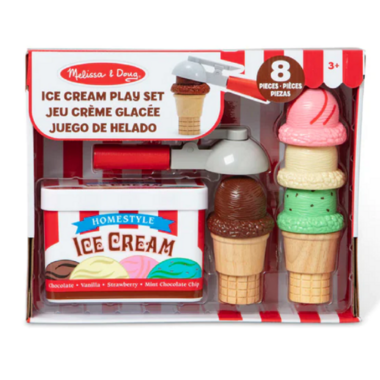 erve up cool treats with this this pretend play magnetic ice cream play set! A magnetic scooper picks up 4 scoops of pretend ice-cream (vanilla, chocolate, strawberry, and mint chip); press the lever and the scoops drop onto wooden cones. Pieces store in a fun plastic ice cream tub. This play set is a great way for kids three and older to practice sharing, and encourages counting, sorting, color recognition, and fine motor skill development. This product is certified by the Forest Stewardship Council. FSC certification ensures that products come from responsibly managed forests that provide environmental, social, and economic benefits, and that forests are protected for future generations.