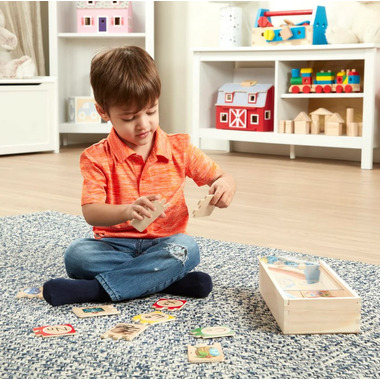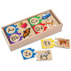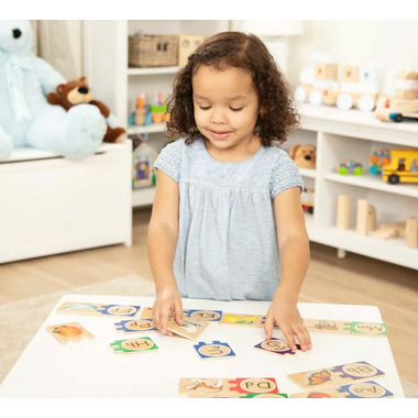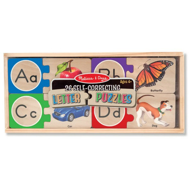 Kids can match these wooden puzzle pairs to make mastering letters as easy as A-B-C! A different object illustrates each letter of the alphabet shown in both upper and lower case, and the puzzles are self-correcting because each puzzle piece has only one match that fits. It's a great way for children to play independently and learn at the same time. The puzzle includes 52 high-quality wooden pieces, and comes in a sturdy wooden box with a slide-in lid for easy storage and accessibility.