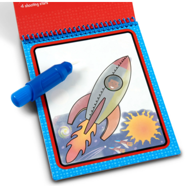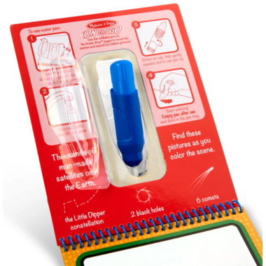 • Melissa & Doug Water WOW! Space: No-mess painting for kids! Simply use the pen to color in each scene—details and vibrant color appear with every stroke! Then let the page dry to erase the pictures and color it in again and again. This space-themed book includes four exciting scenes to color (satellites, rocket ship, lunar landing, and space station), and a search-and-find activity for each scene. The chunky-sized water pen is easy for kids to hold and stores neatly right in the front cover, making this Water WOW! an ideal travel activity book and travel toy for kids!