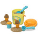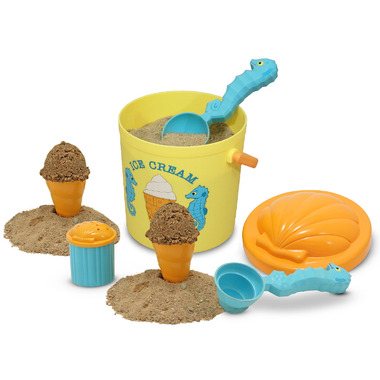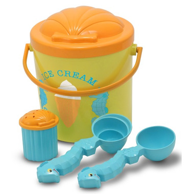 Enjoy "cool" fun in the sun with an ice-cream cone filled with your choice of sandy scoops! Seahorse-shaped molds make round or swirled "ice cream" to top with sprinkles from the shell-topped shaker. Everything stores in a convenient bucket with a lid that doubles as a sand mold!