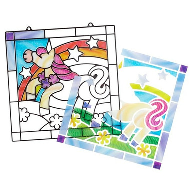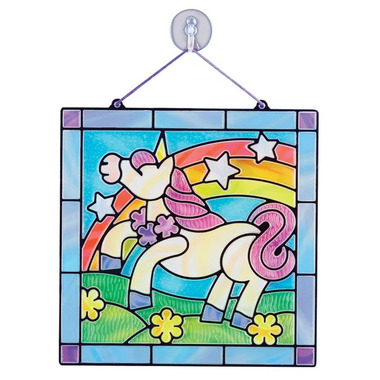 This guided arts-and-crafts activity gives young artists everything they need to create a shimmering "stained glass" work of art. It's easy to create: Just hold up the sheet of colored stickers to the clear frame, peel them off one at a time, and stick them on. Grooves and outlines on the frame make it easy to fit each sticker--featuring realistic textures like bubbles or swirls--into just the right spot. The results are gorgeous: Shaped stickers depict a magical unicorn under a beautiful rainbow. Use the included cord and suction cup to hang the finished artwork in a sunny window to see this pretty scene shimmer to life! Young artists ages 4+ will be enchanted by the glittering results, and proud to show them off.