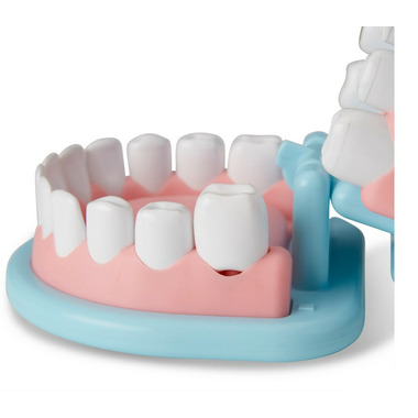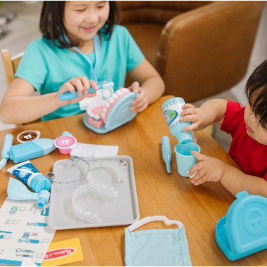 Smile, the dentist will see you now! This 25-piece dental care play set features an over-sized set of pretend teeth so young dentists-in-training can give cleanings, treat cavities, and even fit retainers and braces! Mark the pretend teeth with the cavity stickers, then use the vibrating tool with interchangeable polishing and drill heads, and the toothbrush to clean. The set includes realistic instruments like a pick, mirror, and floss, a dental rinse bottle and cup, 2 gauze pads, 2 tooth polish cups, and an instrument tray to keep organized. A mask, reusable ID tag on a lanyard, and a double-sided reusable activity card round out the dentist’s office experience. The play set is a fun and engaging way to teach good dental health practices, and to ease kids’ fears or feelings of stress associated with a visit to the dentist. Spark a child’s creativity and imagination, and to inspire young dentists for years to come.