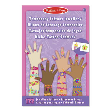 Melissa & Doug Temporary Tattoos Jewelry is jewelry kids wear right now... but on their skin! Temporary Jewelry Tattoos include bracelets, watches, rings, and charms that press right on with a wet paper towel and last for days. Each pack includes over 130 kid-friendly press-on tattoos in cool jewelry shapes to layer and combine. Press on a charm bracelet then add the charms, or put a ring on every finger and toe-with bright colors and cool designs to mix and match, each pack has countless ways to accessorize! Tattoos come on four perforated sheets, so it's easy for children to see them all at a glance and easy to separate the "jewelry" of their choice. Removes easily with oil or rubbing alcohol.