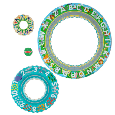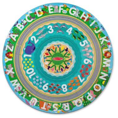 Piece together playtime with this circular puzzle with built-in tracks for wind-up vehicles (no batteries required)! The 48-piece oceanside-themed cardboard jigsaw floor puzzle can be put together as three separate rings or as one complete circle. A groove in the inner ring lets the wind-up boat cruise past sea creatures and the numerals one through 10 to promote number recognition and counting. The outer ring has a track for the wind-up school bus to drive by the letters of the alphabet and pictures that start with each letter (in English).