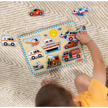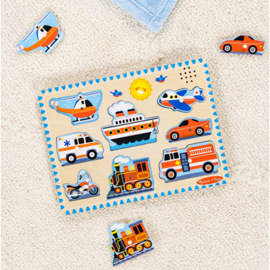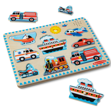 - 8-piece wooden peg puzzle that plays vehicle sounds when pieces are placed in correct wells