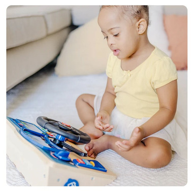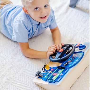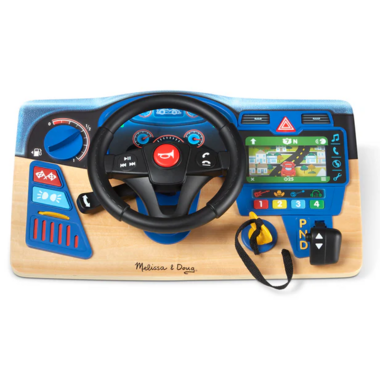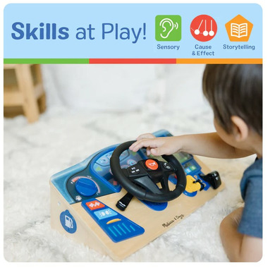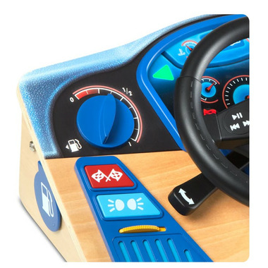 Rev up playtime and take imaginations for a spin with this realistic play steering wheel mounted on a sturdy wooden dashboard with lights, sound effects, and moving parts, including a scrolling GPS! Turn the key to start and shift into drive to get the GPS rolling—turn the wheel to keep the car on the road on the GPS display! The interactive dashboard includes “hands-free” buttons on the steering wheel for a phone and the radio, which plays clips of music for each of four stations. Movable parts and buttons let kids three and older beep the horn, adjust air vents, turn on signal, hazard, and headlight indicators, and rev the engine. Set a timer to count down to empty gas tank and remove the gas cap when it’s time to fill up!