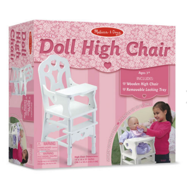 Superior craftsmanship and charming details make this sturdy two-piece wooden high chair the perfect seat for a hungry doll! Featuring a removable, locking tray, this durable white chair will suit any decor and can accommodate dolls up to 20".