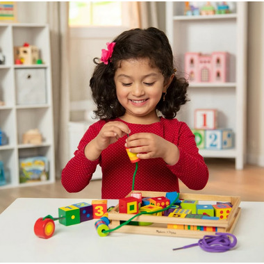 You can count on the Melissa & Doug Lacing Beads set to make a bold statement! The dramatic beads feature a variety of shapes, bold colors, and two extra-long laces, making stringing beads extra special. The shapes are designed for little hands to grasp, and the laces are thin enough to allow the beads to slide easily. Twenty-seven hand-painted wooden beads feature the numbers one to ten as numerals, and as countable dots to add counting fun to this lacing activity. It lets kids practice counting, shape recognition, hand-eye coordination, fine-motor skills, and creative expression. The set allows adults and children to explore multiple playing activities together.