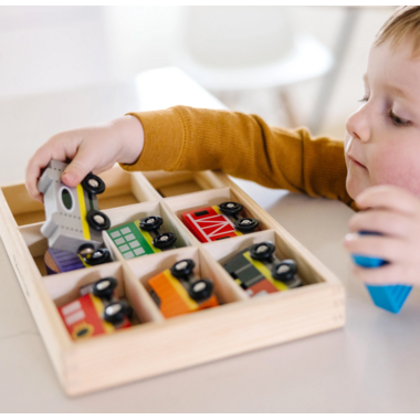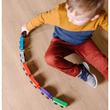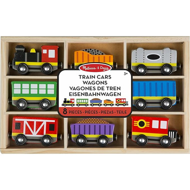 All aboard for some railroad adventures! Eight wooden train cars, each approximately three inches long, link together with magnetic couplers in endless combinations for lots of imaginative play. Brightly painted and beautifully crafted train cars include a steam engine, caboose, coal car, passenger car, and more. This set is sized to play perfectly with Melissa & Doug activity rugs or on its own. Pieces all store neatly in the compartmentalized wooden tray.