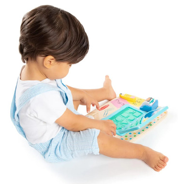 Its never been so much fun for one-year-olds to get to work on developmental skills! Infants and toddlers will love playing with this wooden version of a laptop and desk just like grown-ups do! Open the screen to reveal a peekaboo mirror to tap into babies fascination with faces. Rubberized keyboard buttons are fun to press and help kids develop fine motor skills and shape recognition. Spin the rolling contact list to hear the beads inside tumble.