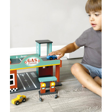 This car garage and service station toy has a printed road baseboard, and lift to take cars to the top floor. A road style ramp for 3 different cars, 2 small gas pumps to fill up your toy car!