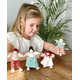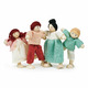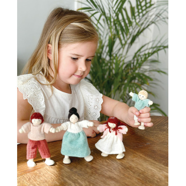This wooden doll family have bendy arms and legs, and are fully clothed in knitted and muslin style fabric. Their look is completed with woollen hair.