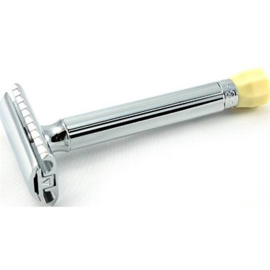 This razor uses double edge blades and features a long handle with a cream-colored, plastic adjustment knob.