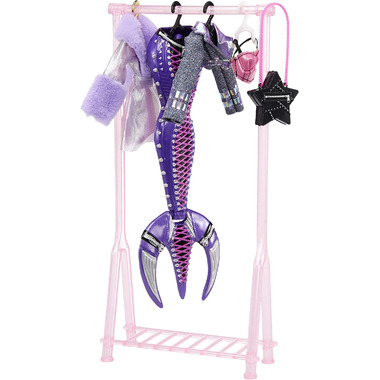 - INCLUDES: 1 Articulated mermaid fashion doll with 2 hair colors in one, 2 interchangeable mix and match sculpted tails and fins, 1 dress, 2 jackets, 1 top, 2 purses, 1 pair of glasses, 1 pair of earrings, 1 bracelet, 1 arm cuff, 4 hangers and 1 clothing rack.