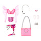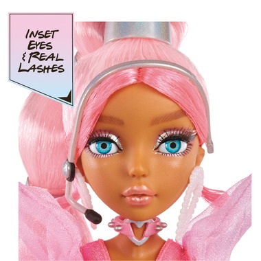 Harmonique has beautiful, premium, light pink hair styled in a bubble ponytail with two loose curly fuchsia tendrils. She has gorgeous glass inset eyes and real eyelashes, as well as fantasy makeup complete with metallic shadow and black and white eyeliner. Harmonique is wearing a dramatic puffed shoulder top and metallic rhinestone bodice. She accessorizes with a headset, metallic harness belt, tote bag, choker necklace, and earrings.