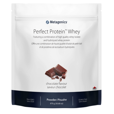 Metagenics Perfect Protein Whey Chocolate featuring a combination of high quality whey isolate and hydrolyzed whey protein
