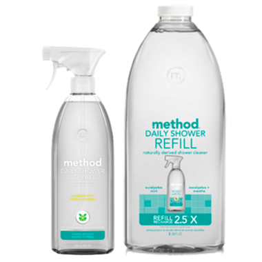 With Method Daily Shower Cleaner Refill Eucalyptus Mint's daily shower spray, you’ll never have to scrub, wipe or rinse your shower again. Just spray a fine mist on all wet surfaces after each shower and it’ll take care of the rest (for best results, start with a clean shower). The Eucalyptus Mint fragrance has a crisp blend of bergamot, citron + lime leaf with eucalyptus + wild mint brings to mind frolicking among the trees in the cool mountain air.