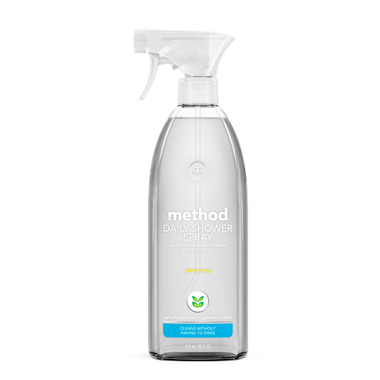 Method Daily Shower Spray Cleaner, Ylang Ylang. Effortlessly maintain the shine on your shower with plant-based cleaning power. This biodegradable formula dissolves and helps prevent soap scum and keeps doors + tiles gleaming. Just spray after you shower, no squeegee, no rinsing, no effort required.